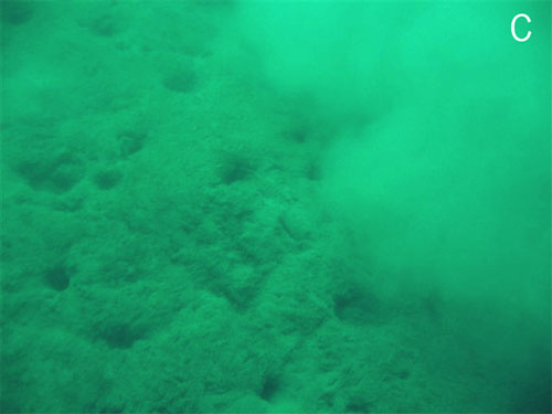 View of numerous holes from venting gas, and “cloud” of waste created when disturbed. Location C (Photo: Kathy and Dave Brush)