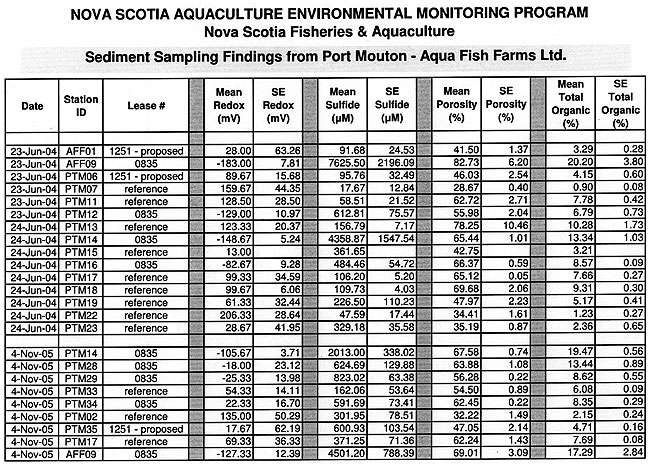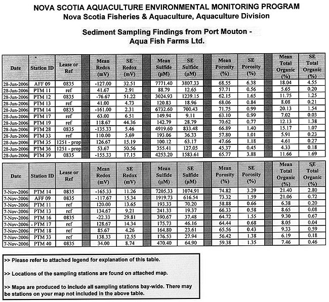In December 2006, the Province released sulphide test results (2003 to 2005) from finfish and shellfish operations in Nova Scotia. Judging from Aqua Fish Farms' test results for the same time frame, this site was deemed to be the worst site in the Province; the only one to be labeled as Type C.