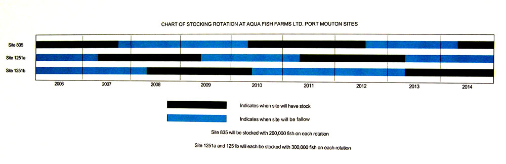 Aqua Fish Farm planed to rotate fish production between its original and proposed sites. Site 835 to be stocked with 200,000 fish. Site 1251 to be divided into two production areas: 1251a and 1251b, each to be stocked with 300,000 fish.