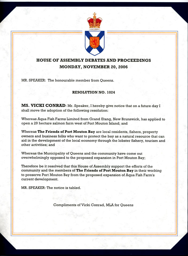 Queens Progressive Conservative Association, meeting on November 16, 2006, came out in opposition to the proposed fish farm application. They voted unanimously to pass the following motion: