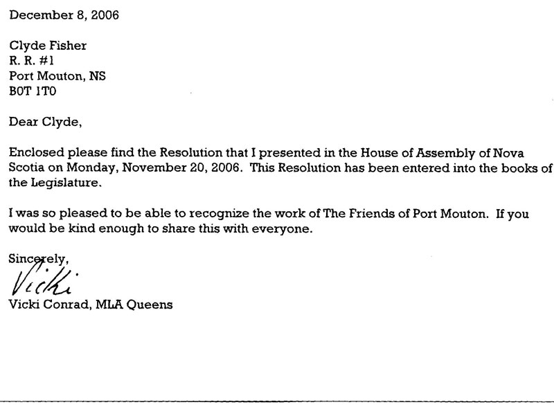 Vicki has been active in supporting the efforts of Friends of Port Mouton Bay. On several occasions, Vicki has posed questions on the fish farm application to the Minister of Fisheries and Aquaculture in the Provincial Legislature. On November 1st, she presented the petition, with over 1800 signatures opposing the project, to the House.